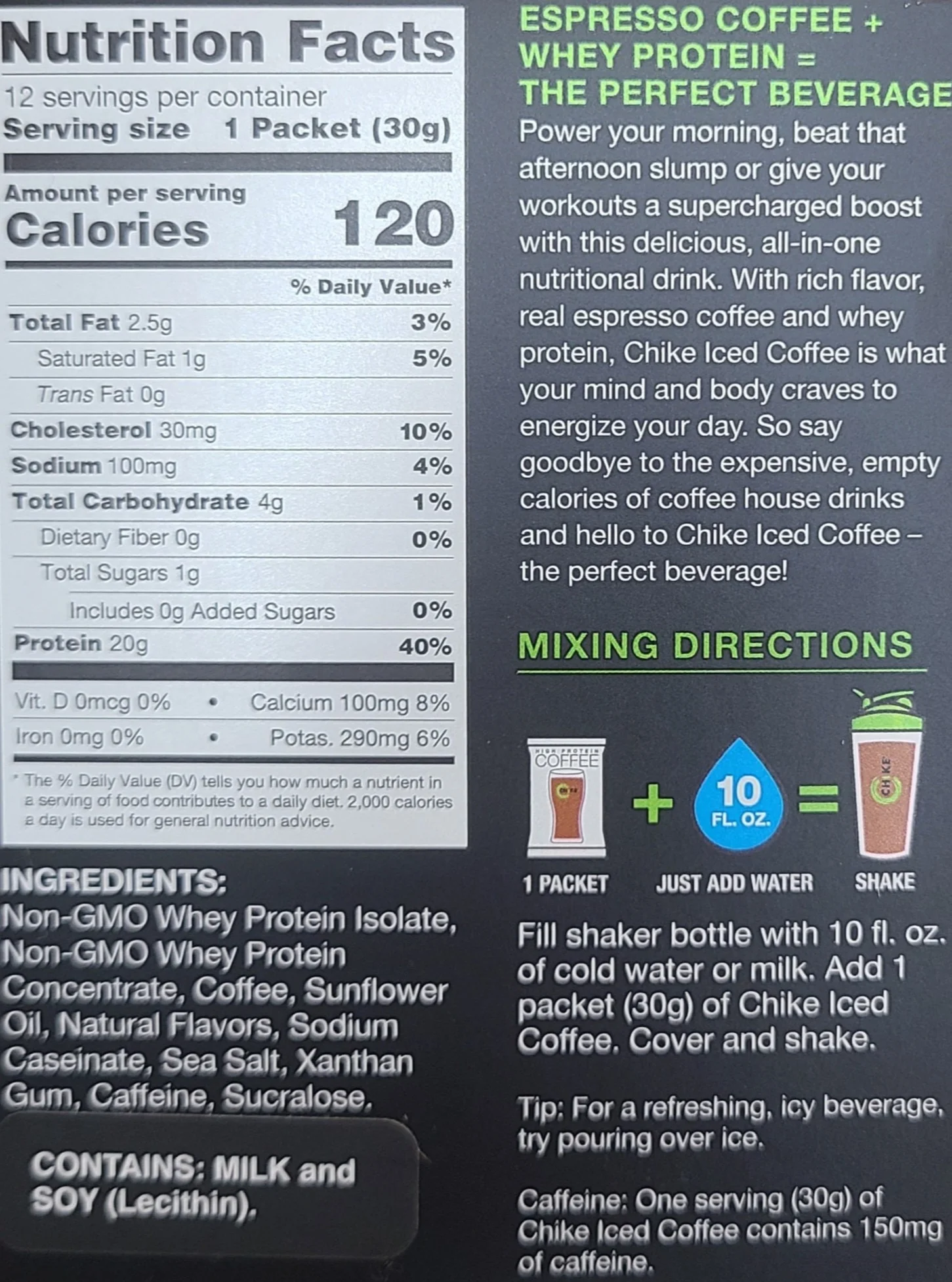 Each Single Serving Packet contains 2 shots of authentic espresso coffee (150 mg caffeine), equivalent to a cup of leading premium coffee. Chike Iced Coffee offers a wholesome and practical alternative to the costly, high-calorie drinks typically found at coffee shops. Savor guilt-free indulgence with just 120 calories and a mere 1 gram of sugar per serving while reaping the benefits of supporting a healthy weight, satisfying hunger, and promoting lean muscle growth.